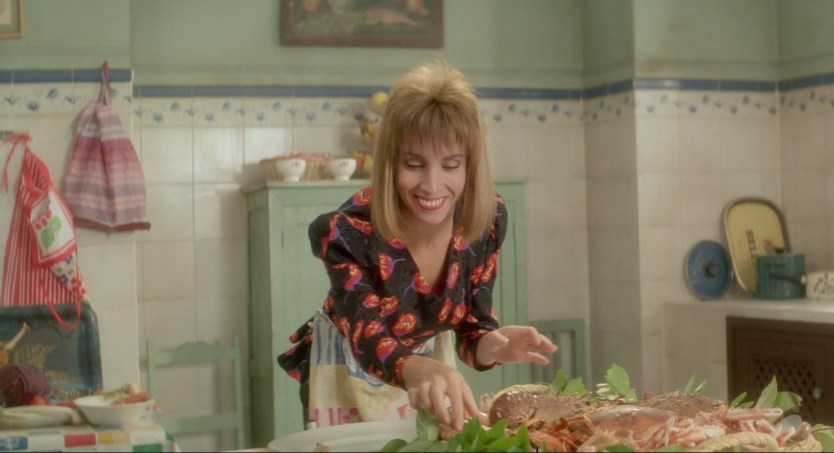 García Sánchez y Azcona no sitúan en un único lugar, la plaza donde se desarrolla el rodaje, junto al piso de Paloma, que parece la casa de los líos, y la roulotte de Luis Doncel, el actor, espacios todos ellos donde las desventuras de este grupo de caraduras y mamarrachos, siempre con humor, deambularán de un sitio para otro, todos andan detrás de un objetivo que, en principio desconocen que sea común, todos aman a Paloma, todos y cada uno de ellos, a su manera, que nunca parece que sea la más adecuada para Paloma, una mujer resignada a una vida insignificante, vacía y rutinaria (como define su atuendo de arranque de la película, ese chándal rosa y el abrigo de leopardo de pega, y qué decir de su peinado, el último grito de la pelu de la esquina). La llegada del cine, en este caso una serie, donde el actor-galán de tres al cuarto (con sus postizos de todo tipo, el pelo en pecho, la dentadura, incluso sus sentimientos) es el que lleva la voz cantante, el que tampoco se resistirá a los encantos de la maruja de barrio que es Paloma.