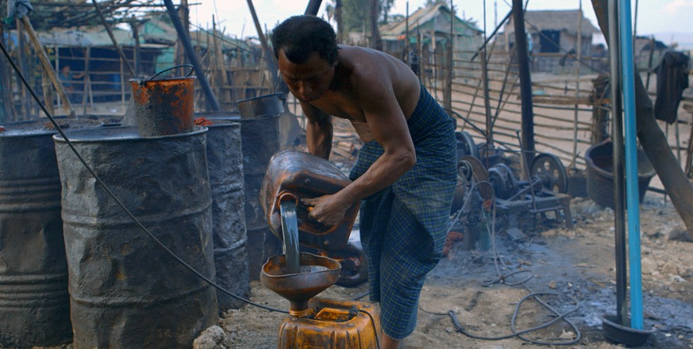 La película se abre de forma magnífica y muy descriptiva. Vemos una zona rural, una tierra que emana fuego, agujereada de pequeños pozos que de forma manual intentan sacar petróleo del subsuelo. El sonido natural ha dejado paso a un intenso ruido mecanizado de las diferentes máquinas y motores rudimentarios para extraer el valioso oro negro. Nos encontramos en Myanmar (Birmania), y conocemos al matrimonio Thein Shwe y Htwe Tin, que han dejado la agricultura y se dedican a la extracción de petróleo manual, un trabajo durísimo, sucio, asfixiante, y sobre todo, muy explotador para el rendimiento que se saca, en un subsuelo cada vez más seco. Zin Ke Aung, el hijo de la pareja, se niega a seguir la tradición familiar y quiere probar suerte con su sueño de futbolista en la ciudad. La familia le apoya, pero también, le entristece perder a su único hijo.