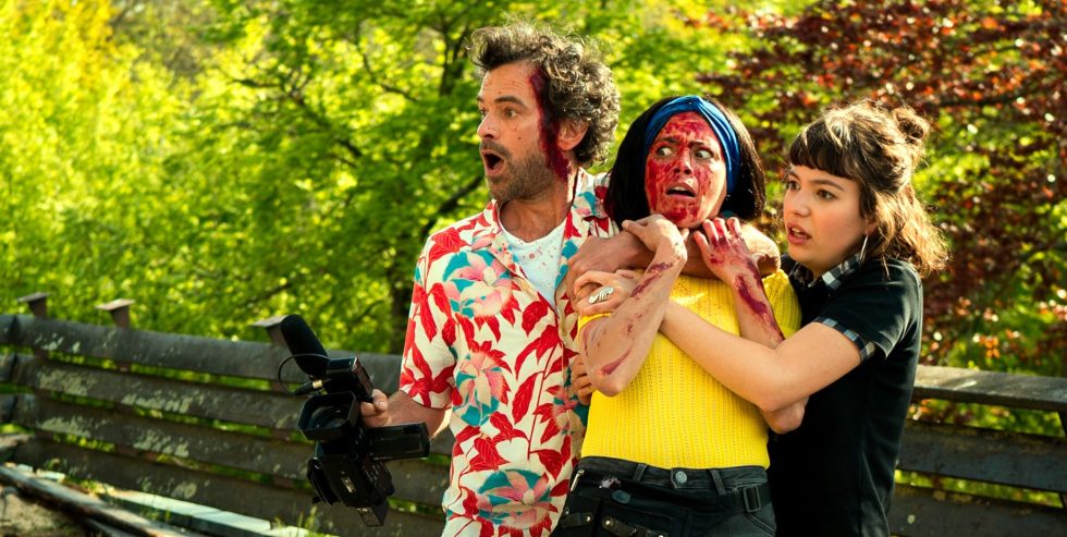 Aunque todo hay que decirlo, con Corten!, nunca nos había divertido tanto ni lo habíamos visto tan desatado y gamberro, quizás la película original en la que se basa tiene mucha responsabilidad, porque One Cut of The Head (2017), de Shinichirô Ueda, película japonesa de fin de carrera, es todo un sincero y apasionado amor al cine, y sobre todo, a las ganas de hacer cine con los medios ridículos que se tengan, la misma sensación que tiene Remi (enamorados hemos quedado con la increíble interpretación de Romain Duris, que nunca lo habíamos visto tan alocado, nerviosísimo y sobre todo, tan encantador), porque tiene el encargo de hacer una película en directo y en plano secuencia, ahí es nada, y se empeñará con sabiduría, fuerza y todo lo que haga falta para acabar el rodaje y por ende, la película. El director francés, muy fiel al original, y con ecos de Zombies Party (2004), de Edgar Wright (una de las más gloriosas parodias del cine de zombies de los últimos años), nos sitúa en el rodaje de una película, en una película que tiene muchas partes dentro de sí misma y también, en una comedia, con muchas texturas y formas.