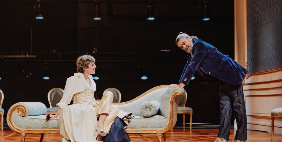 La novela tiene miga, como se decía antes, porque ya en su prólogo nos ponen sobre aviso que aunque está publicada en el siglo XVIII, en los albores de la Revolución Francesa, lo que allí ocurre nada tiene que ver con su época, porque sus personajes visten y se relacionan con formas y costumbres que no son de la época y sí de otras, mezcladas e inventadas como muy bien acoge López en su montaje, con ese vestuario y caracterización, que abandona las pelucas y los excesivos maquillajes, y mantiene una ropa que combina diferentes épocas y deja ver los soportes de las faldas que se colocan por encima de la citada prenda, con un aire muy moderno, con los pantalones de la Marquesa de Merteuil, y esa vistosidad de colores y formas. Quizás, la historia que nos cuenta es que la que conocemos más de antemano, con ese pacto-estrategia al que llegan los dos protagonistas principales, la mencionada Marquesa y el Vizconde de Valmont, vaya dos, la fama les precede, de libertinaje y amantes efímeros, y de jugar con los sentimientos y vete tú a saber. Su trato perverso consiste, por si hay alguien que no lo recuerda; en que, si Valmont seduce a Madame de Tourvel, una mujer casada que destaca por su virtud, podrá tener una noche de placer con Merteuil. El juego ha empezado, y también, entran en liza la joven e ingenua Cécile, hija de Volanges, prima de la Marquesa, que será usada por Valmont para conseguir su objetivo. Habrá dos más almas en esta situación, Rosemunde, tía del Vizconde, y Danceny, el joven y apuesto profesor de inglés de Cécile, del que se enamorará perdidamente.