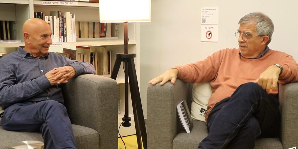 Presentación del libro «Els cinemes de la meva vida», de Carles Mir, con la presencia del autor y Esteve Riambau, director de la Filmoteca de Catalunya, en la Biblioteca de la institución en Barcelona, el jueves 23 de noviembre de 2023.